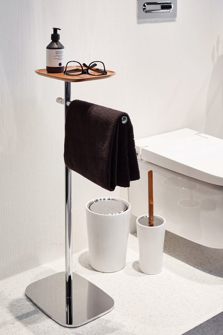 Because of its minimal design, the Aurora Towel Valet Stand blends easily with many décor themes. It matches modern, contemporary, and luxury interiors. The slim structure also saves space, yet it still provides enough room for all your daily essentials. Therefore, it improves both the look and function of your bathroom.