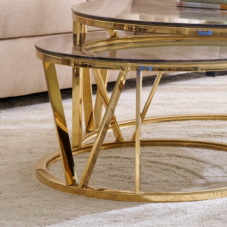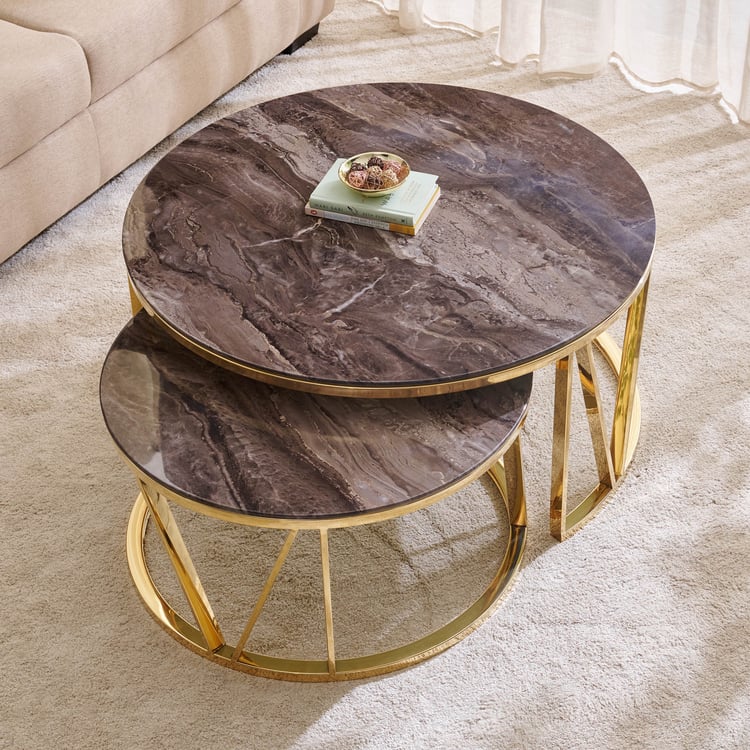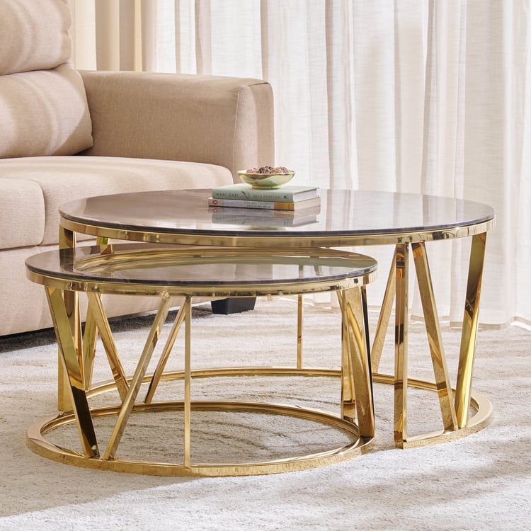 This nesting table set features a polished marble-style top that looks rich and smooth. Moreover, the round shape adds a soft and elegant touch to your home décor. The smaller table slides neatly under the larger one, which helps you save space when needed. For example, you can use the small table when guests arrive or leave it nested for everyday use. Also, the combination of golden legs and marble finish makes the set look luxurious without being too flashy. The tables work well with sofas, lounge chairs, and modern interior setups. Additionally, the design is easy to match with other furniture.