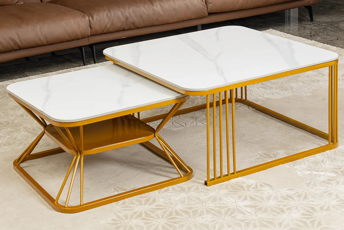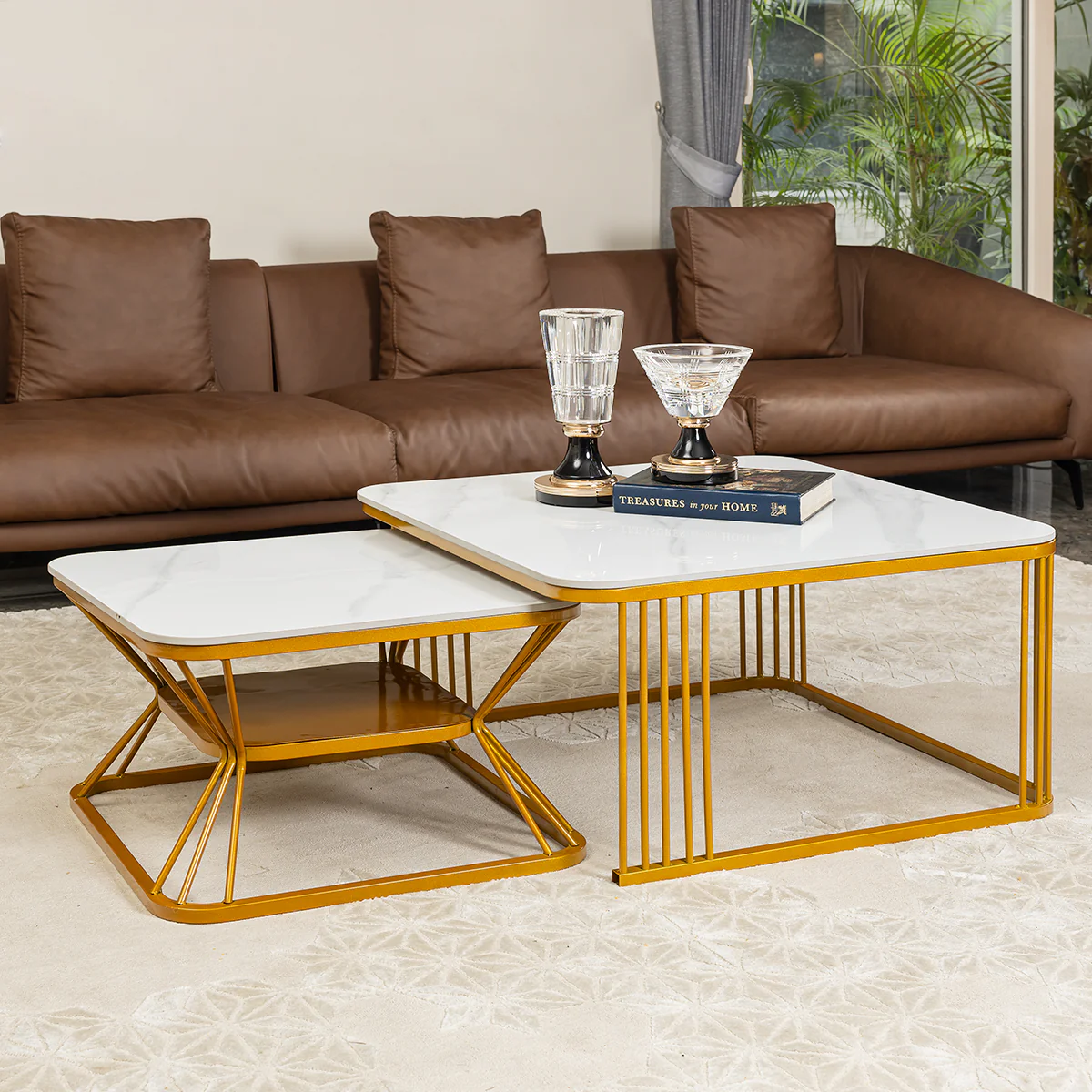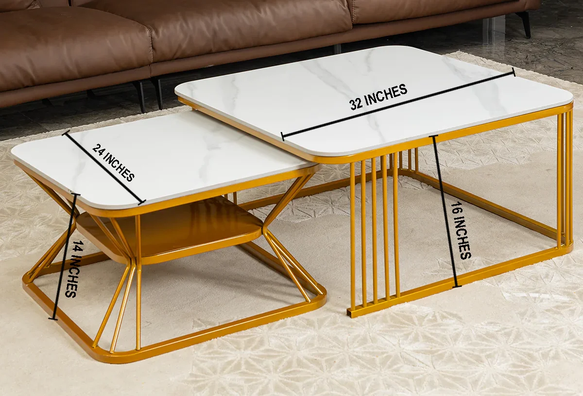 This table set stands out because of its modern square design and golden metal base. Moreover, the marble-style top adds a smooth and premium finish to your living room. The smaller table can be neatly placed under the larger one when you want more space. For example, you can pull out the smaller table during gatherings or use it as a side table. Also, the gold structure with thin vertical lines adds a rich and artistic touch. Additionally, the clean white top reflects light and brightens up the room instantly.