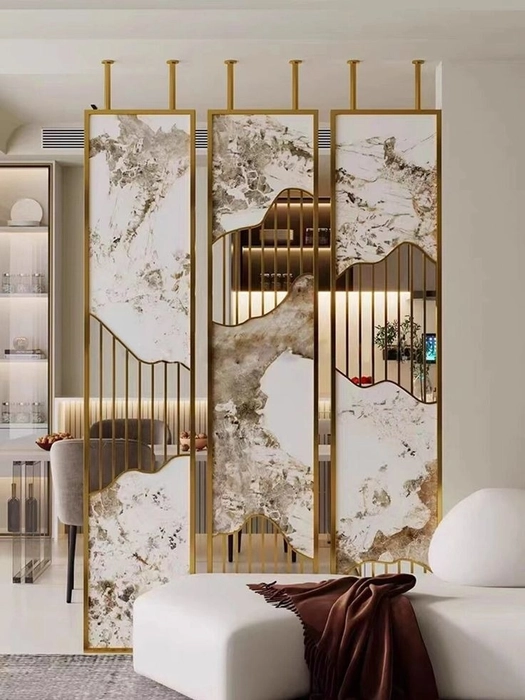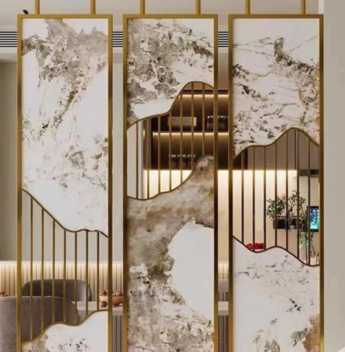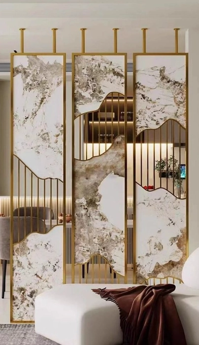 The Anat Moka Stainless Steel Partition adds a rich, modern touch to any interior. Designed with premium marble-finish panels and a sleek gold stainless steel frame, it brings elegance and structure without blocking natural light. The warm gold accents blend beautifully with the marble texture, making it a standout décor element for living rooms, dining areas, offices, or commercial settings.